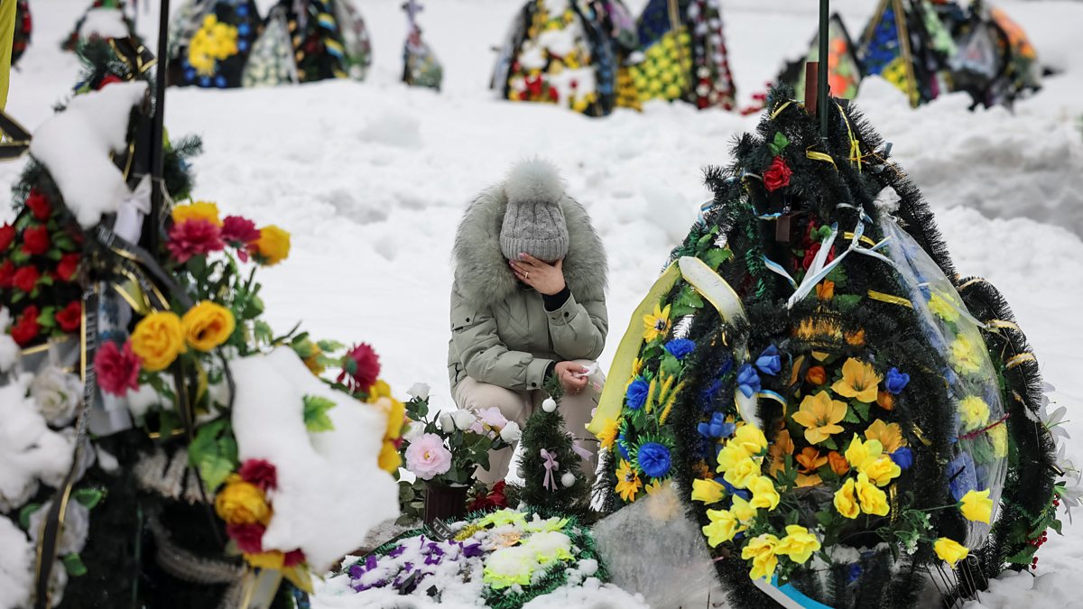 (Photo: A woman reacts as she sits in front of a grave at a local cemetery, decorated with flowers to pay tribute to the victims of the Russian attack on Ukraine, on the day marking the fourth anniversary of the full-scale Russian invasion, in Chernihiv, Ukraine, 24 February, 2026. Credit: REUTERS/Maksym Kishka)
