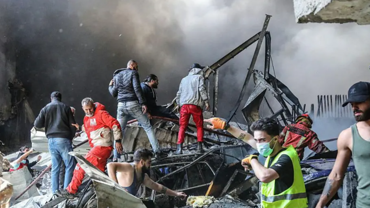 (Wreckage after Israel launched a blitz of air strikes on Lebanon on Wednesday CREDIT: AFP via Getty Images)