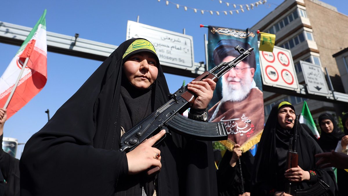 (Photo: An Iranian woman holds a gun next to a poster of late Iranian supreme leader Ayatollah Ali Khamenei; Credit: Abedin Taherkenareh/PA/Shutterstock)