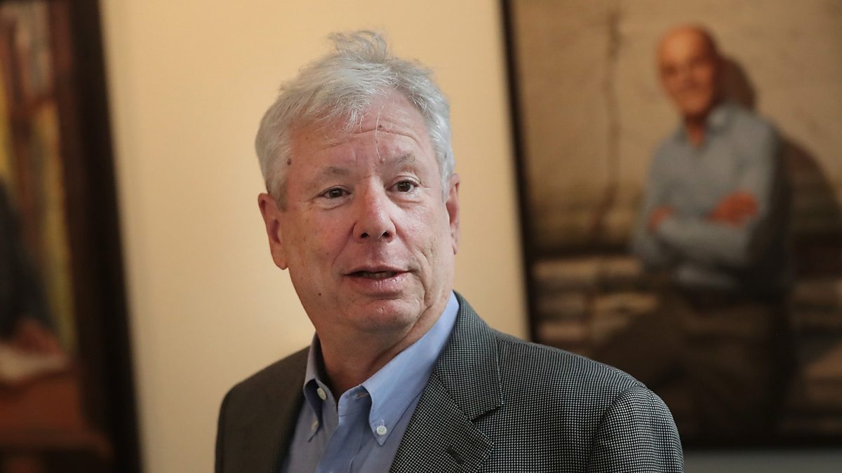 (Professor Richard Thaler standing in front of portraits of previous winners at the University of Chicago. Credit: Scott Olson/Getty Images)