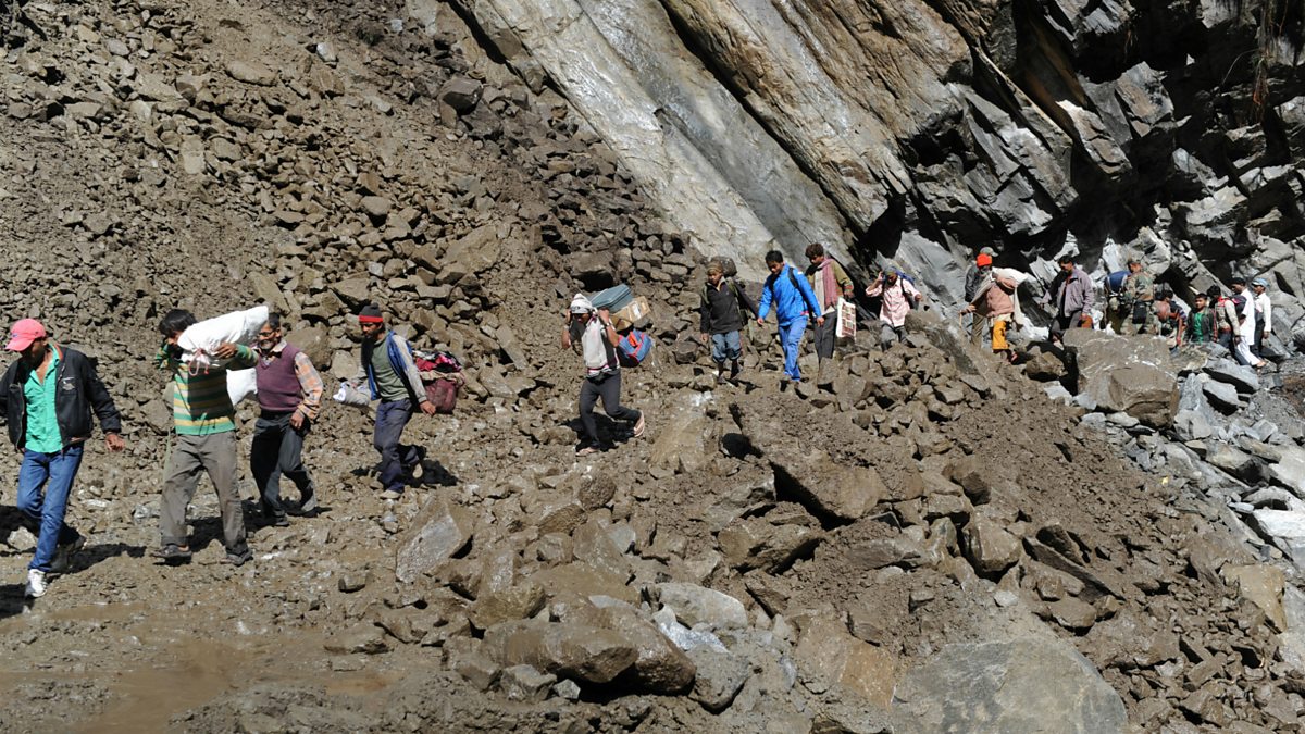 Image: Stranded villagers walking across a landslide caused by overnight rains in Govindghat, India
