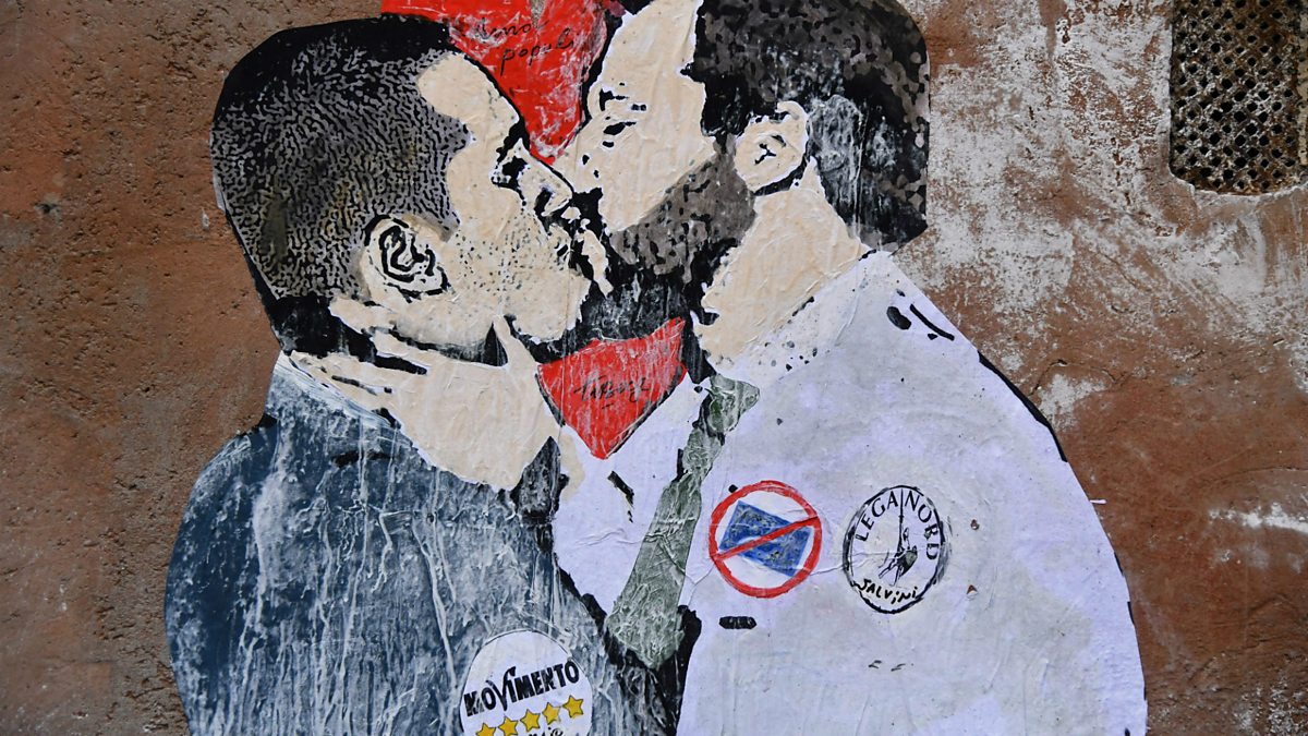 (Picture: A mural by artist TVBOY depicting Five Star Movement leader Luigi Di Maio kissing Northern League leader Matteo Salvini, seen on a wall in Rome in March 2018. Credit: Tiziana Fabi, Getty Images)