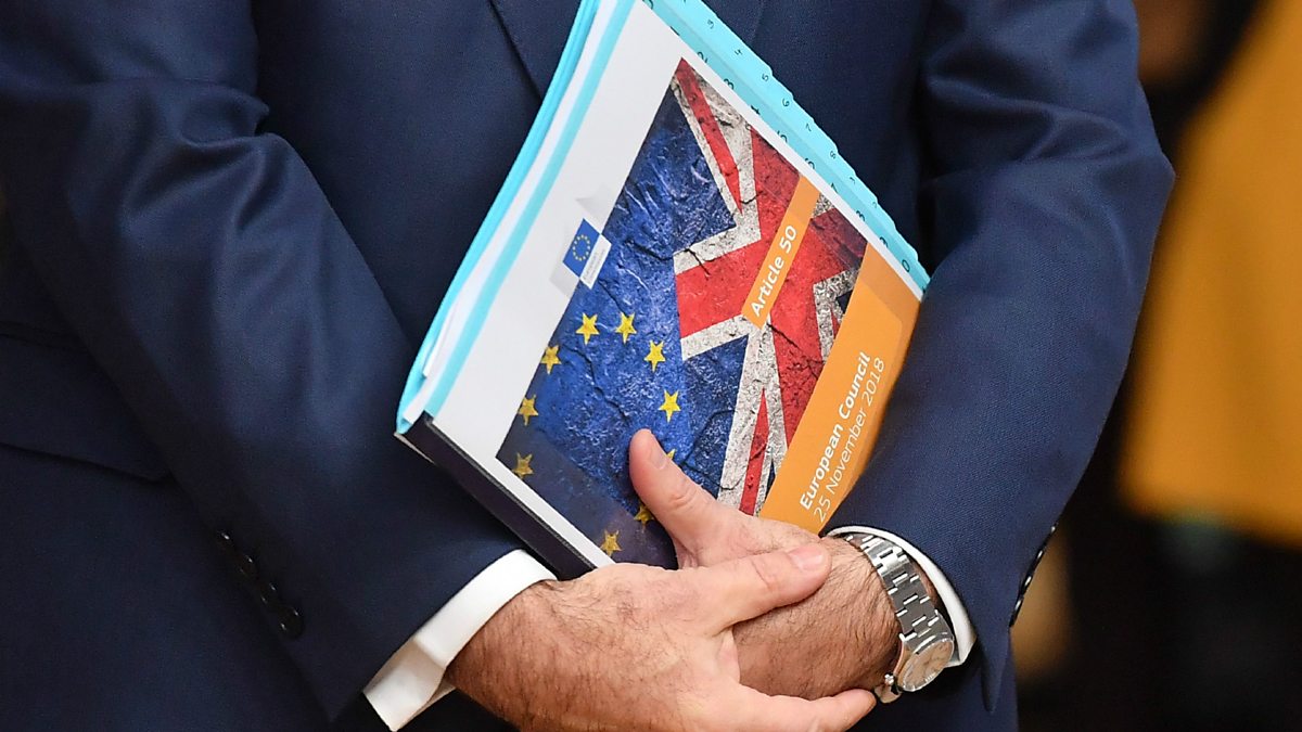 (Picture:The Eu and UK flags on the front page of document reading: 'Article 50 - European Council' before the special meeting of the European Council to endorse the draft Brexit withdrawal agreement. November 25, 2018 in Brussels. (Credit: EMMANUEL DUNAND / AFP/ Getty Images)