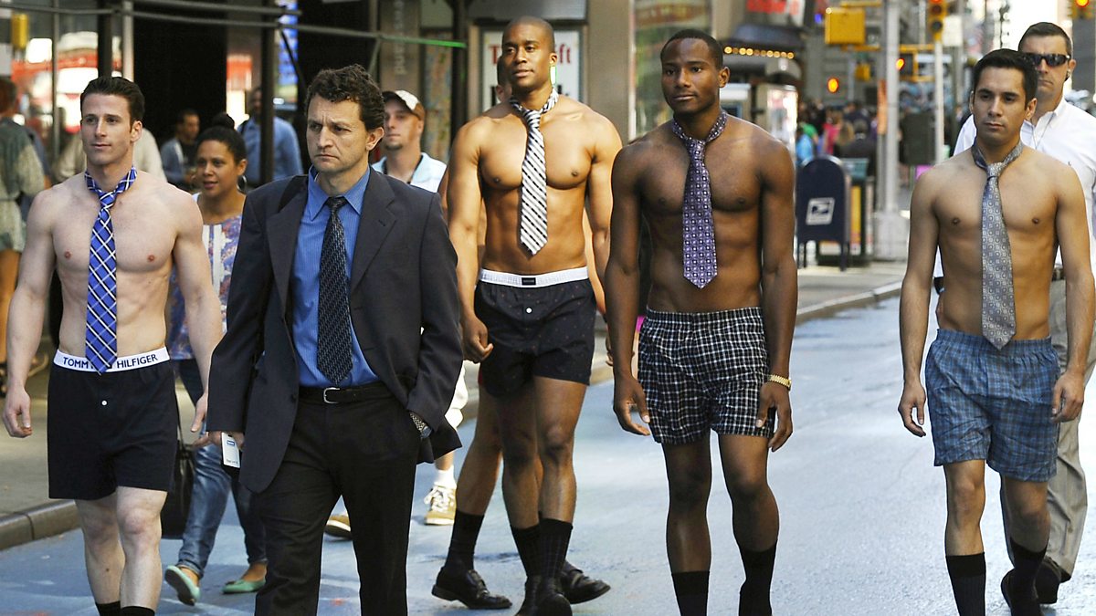 (Picture: Male models in underwear follow a businessman. Credit: Getty's Images)