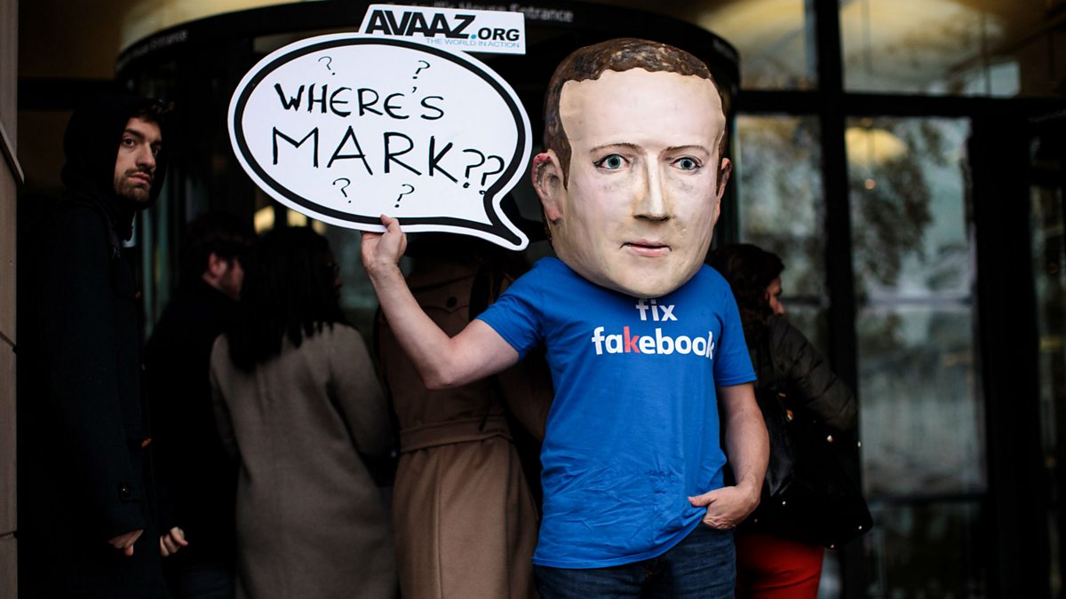 (Image: A protester wearing a model head of Facebook CEO Mark Zuckerberg, highlighting his absence from a hearing in London where international lawmakers met to investigate "fake news" online, Credit: Jack Taylor/ Getty Images).