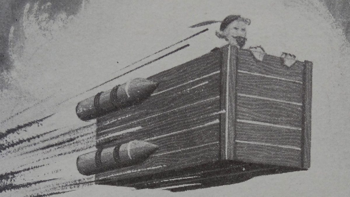 Picture: To the moon by rocket-propelled box, 1640 as foreseen by Cyrano de Bergerac (1619-1655). Photo by: Universal History Archive / UIG via Getty Images)