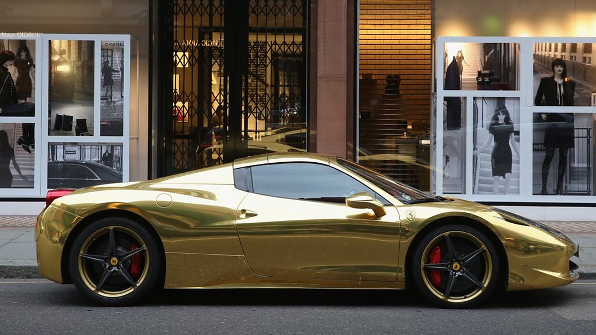 (Photo: A gold Ferrari parked outside an expensive boutique in London, Credit: Getty Images)