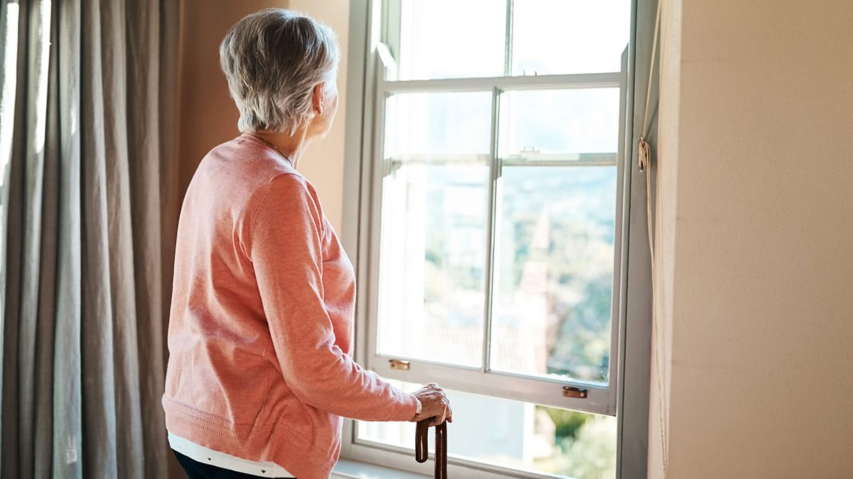(Photo: A senior woman with a cane looking out of a window. Credit: PeopleImages/Getty Images)