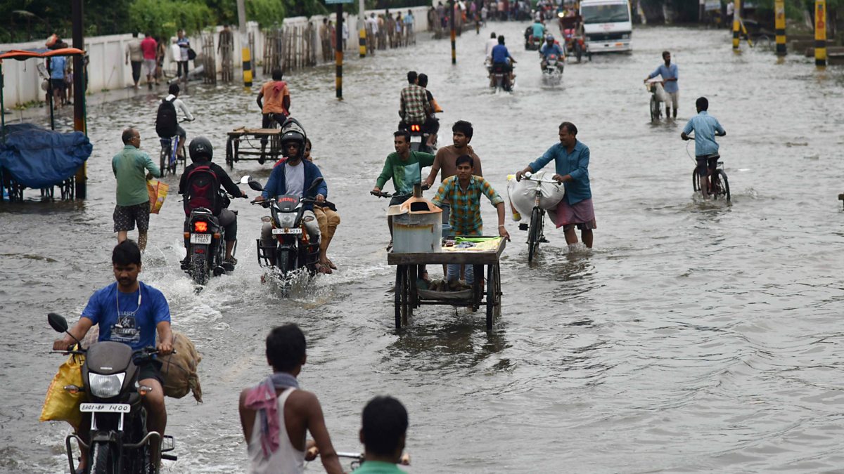 (Photo: Commuters make their way on a waterlogged road following heavy rainfalls in Patna.Credit:Getty Images)
