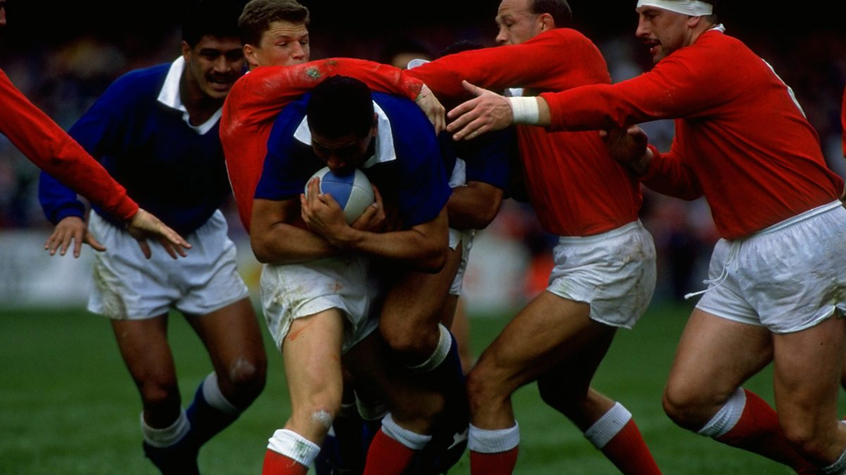 PHOTO: Welsh players try to tackle Pat Lam of Western Samoa (Simon Bruty/Allsport/Getty Images)