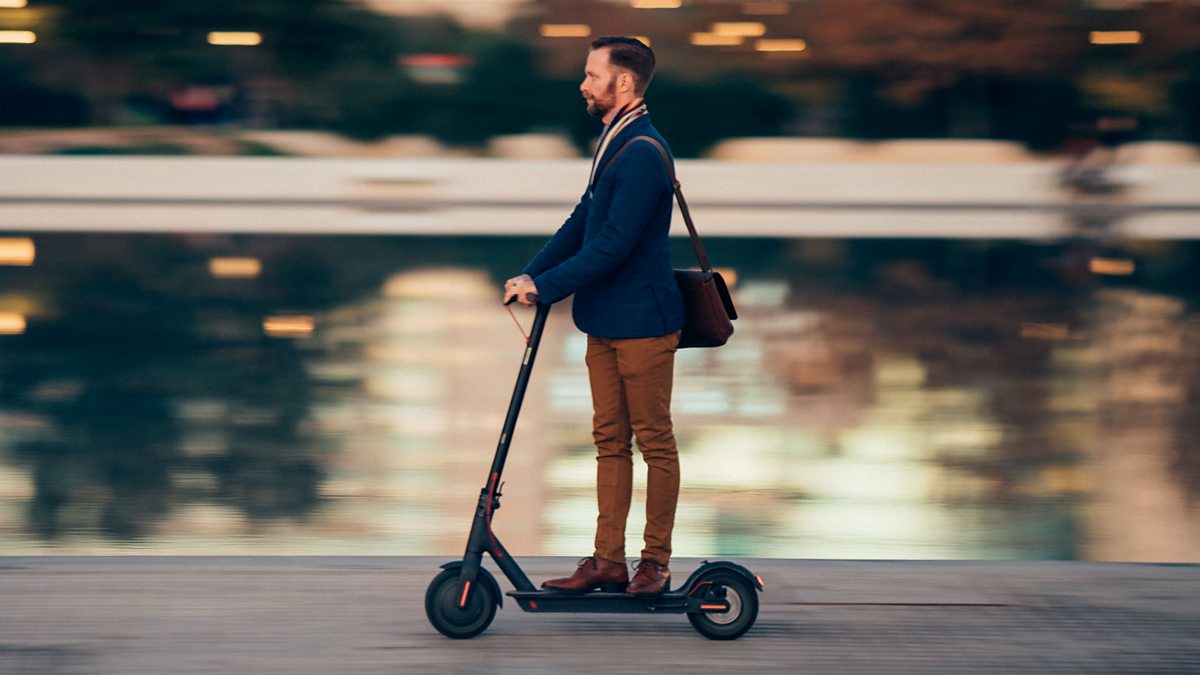 (Image: A man in a suit riding an electric scooter in town, Credit: Getty Images).