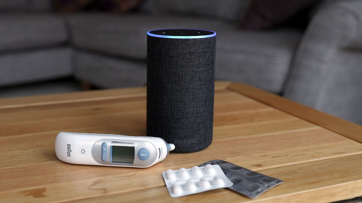 (Image: An Amazon Echo smart speaker on a coffee table alongside an ear thermometer and some pills, Credit: Andrew Matthews/ PA Wire).