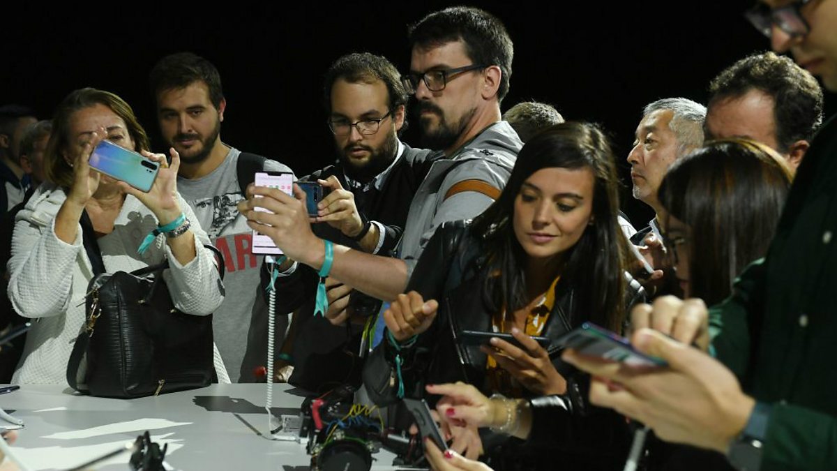 (Photo: Enthusiasts and the media get their hands on Huawei's latest smartphone at its launch in Munich, Germany, 2019. Credit: Christof Stache/AFP/Getty Images)