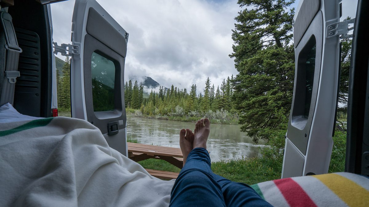 (Image: Woman looks out the back of her camping van. Credit: Stock Photo/Getty Images)