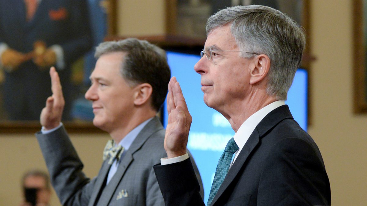 (Picture: US diplomats George Kent and William Taylor are sworn in before giving public evidence to the Trump impeachment inquiry in Washington.
