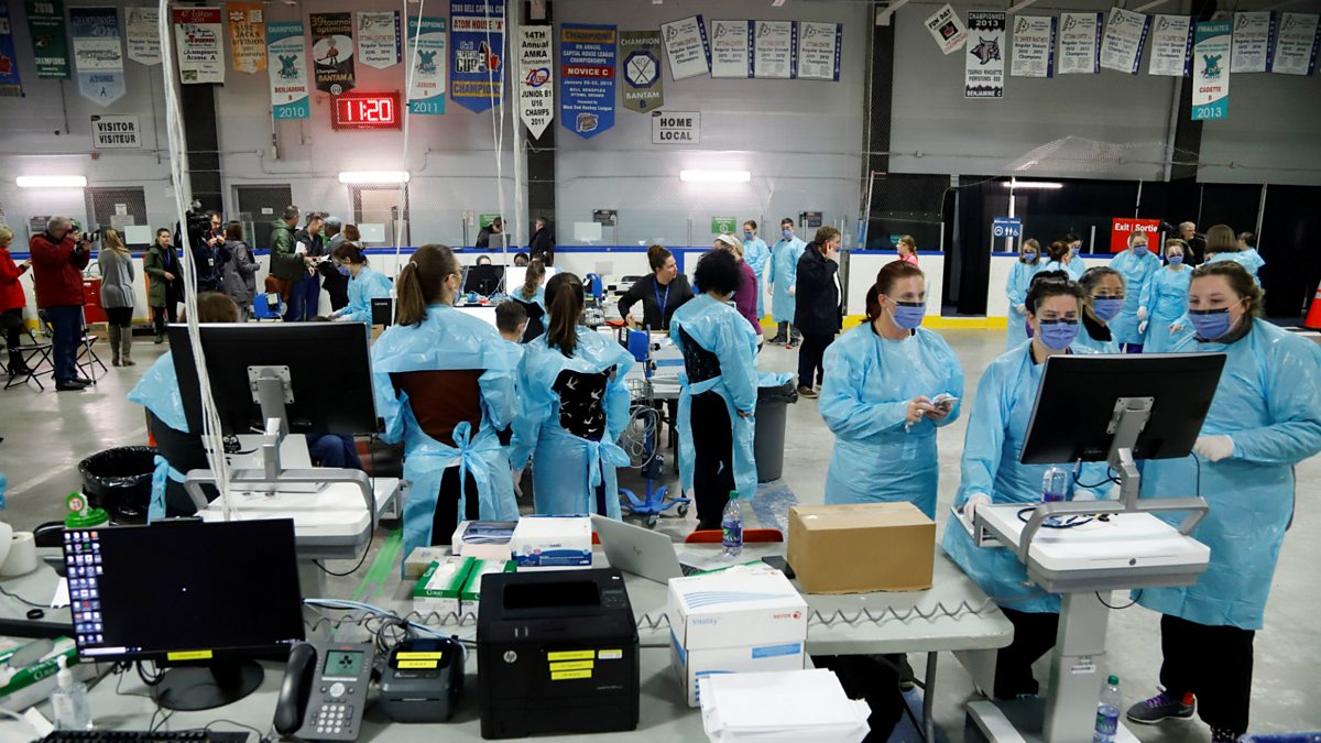 (Picture: Medical staff in Canada prepare to receive patients for screening at an ice hockey arena.
