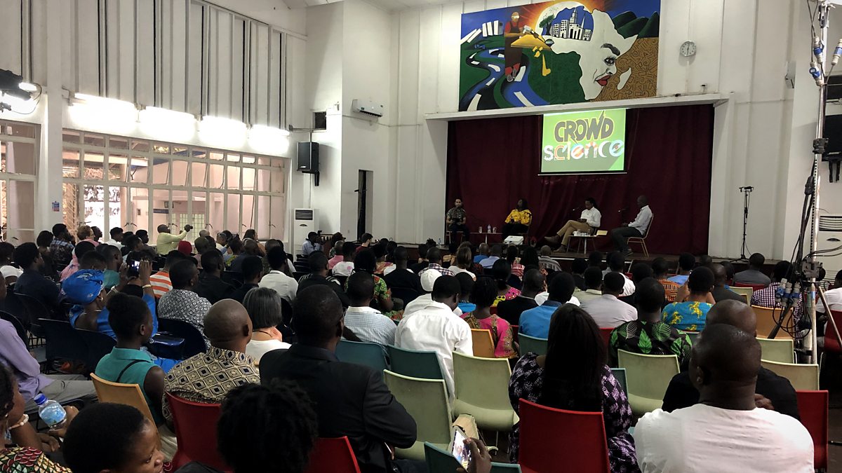 (Photo: The panel and Audience at Crowd Science live event in Sierra Leone. Credit: BBC)