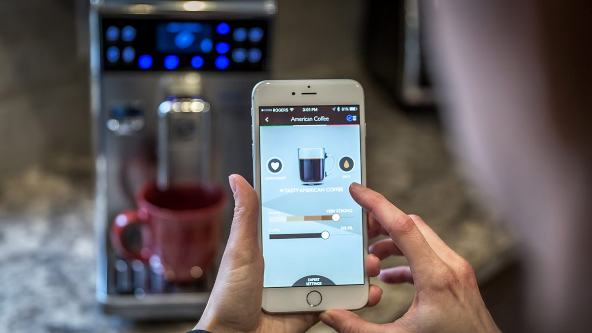 (Photo: Mobile phone app controls a bluetooh coffee machine. Credit: Getty Images)