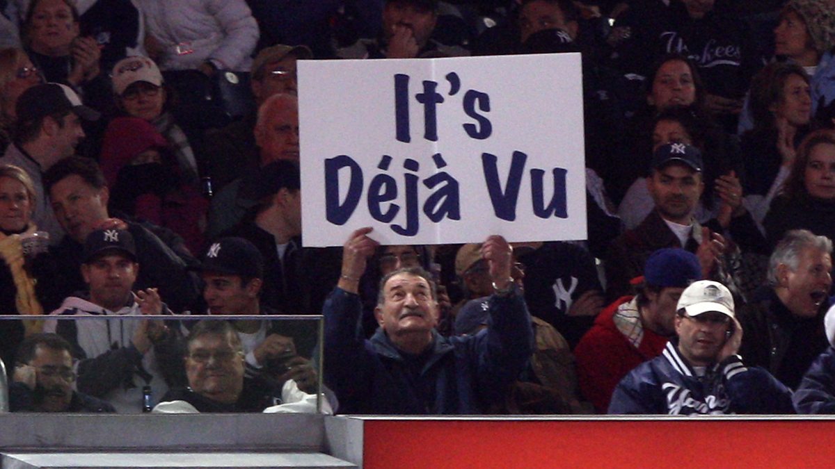 Main Image: A fan of the New York Yankees holds up a sign which reads "It's Deja Vu" at the Yankee Stadium, New York City 29 Oct 2009. Credit: Jed Jacobsohn / Getty Images