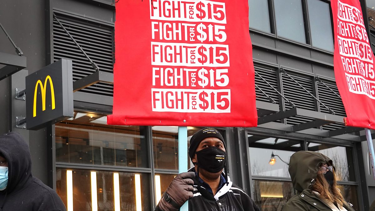 (Photo: Demonstrators participate in a protest calling for a $15 minimum wage outside of McDonald's corporate headquarters on January 15, 2021 in Chicago, Illinois. Credit: Getty Images)