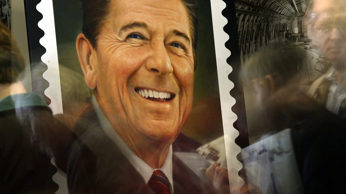 (Picture: A poster of a Ronald Reagan commemorative postage stamp on display as people pass by; Credit: Stephen Osman/Los Angeles Times via Getty Images)