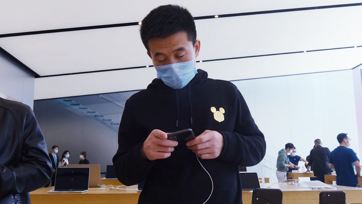 (Image: A customer wearing a face mask tries out the latest iPhone SE at an Apple store in Hangzhou, China. Credit: Getty Images).