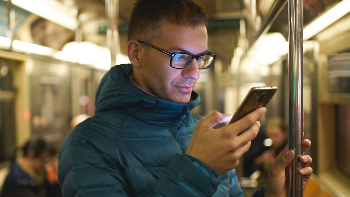 (Image: Stock photo of a man riding on public transport holding up and looking closely at his smartphone, Credit: Nico De Pasquale Photography/ Getty Images).