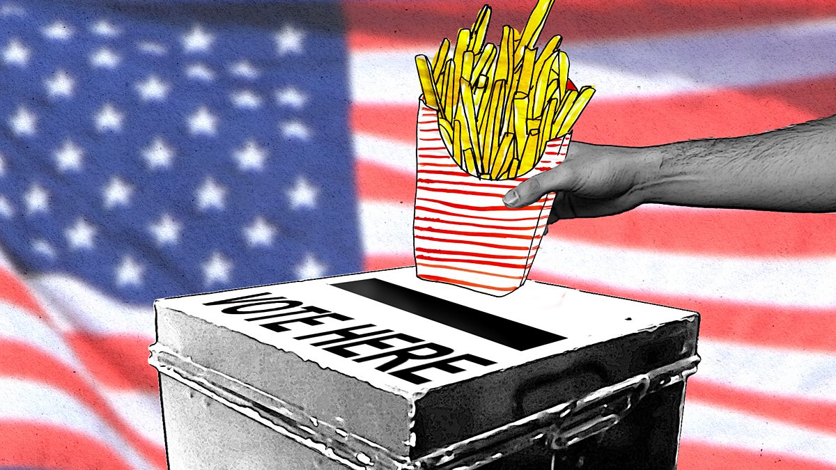 (Picture: Fries being dropped into a ballot box. Credit: Getty Images/Katie Horwich/BBC)