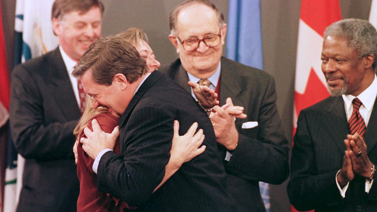 Picture: Jody Williams at the signing of the Ottawa Treaty, alongside dignitaries including then United Nations Secretary General Kofi Annan. (Credit: Dave Chan/AFP via Getty Images)