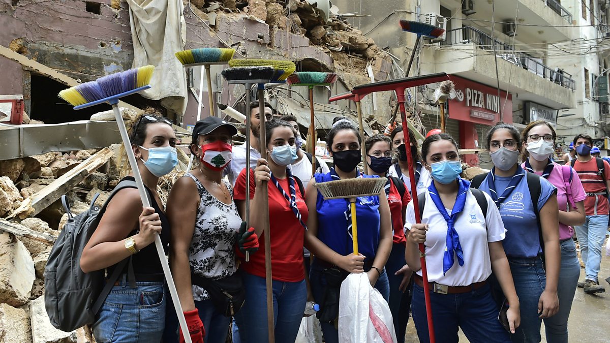 Photo: People help to clean debris after massive blasts in Beirut, Credit: Houssam Shbaro/Anadolu Agency via Getty Images