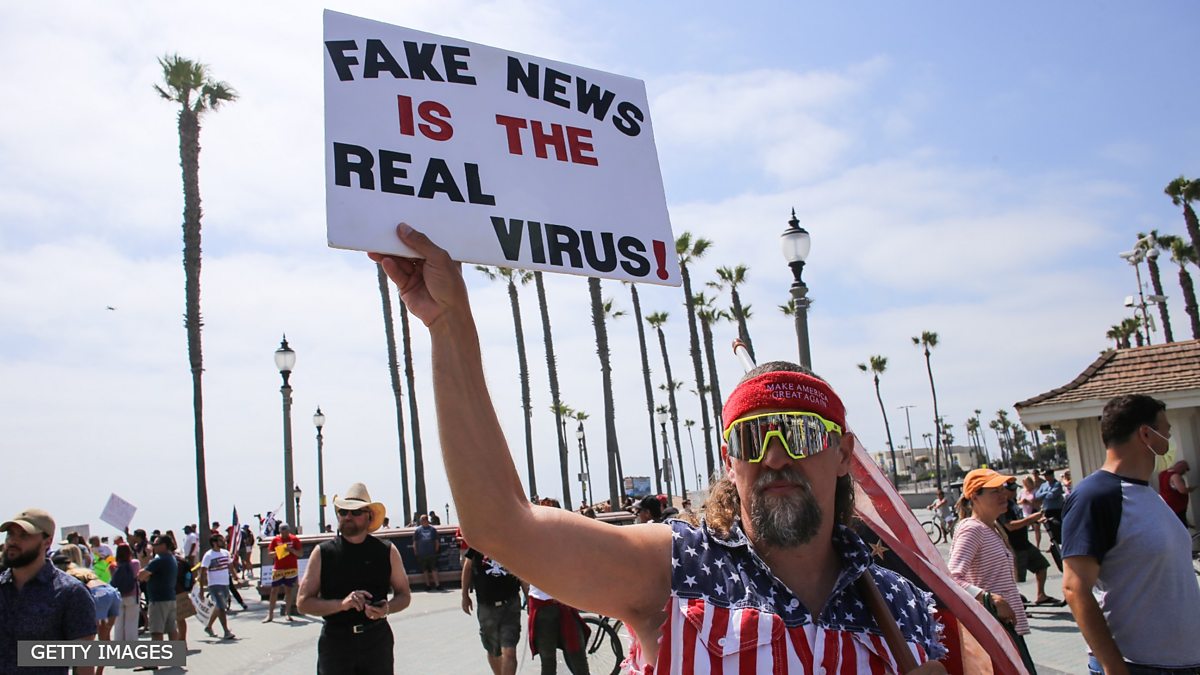 (Photo: A protester holds a placard that says Fake News Is The Real Virus. Credit: Stanton Sharpe/SOPA Images/LightRocket/Getty Images)
