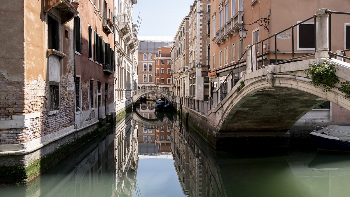 (parked gondolas in a clear silent canal in Venice, Italy, April 19, 2020. Photo credit:Pietro D'Aprano/Getty Images)