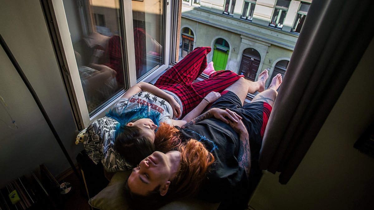 (Photo: A make-up artist (L) and her musician boyfriend take a rest during their self-isolation at their home in Budapest. Credit: EPA)