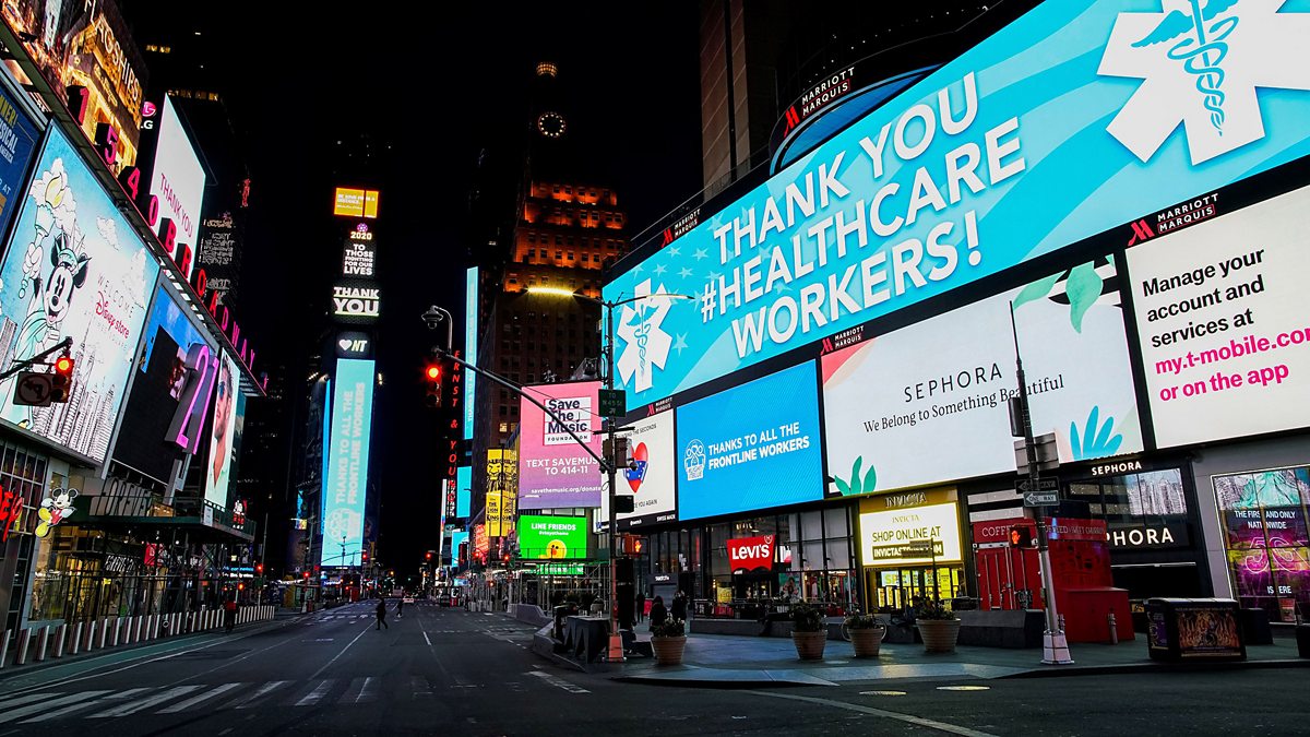(Photo: Times Square screens are illuminated in blue as part of the "Light It Blue" initiative to honor healthcare workers, during the outbreak of the coronavirus disease. Credit: Eduardo Munoz/ Reuters)