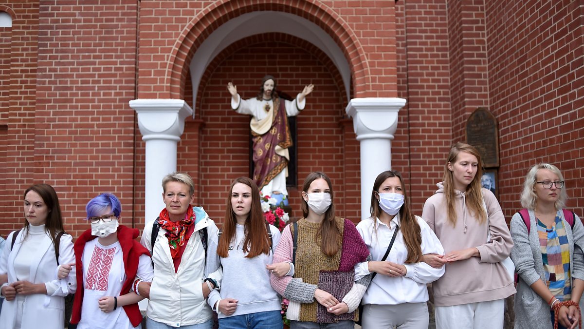 (Photo: Women form a human chain outside the Catholic Church of Saints Simon and Helena to protest against police violence during opposition rallies against the 2020 presidential election results. Credit: Sergei Gapon/AFP)