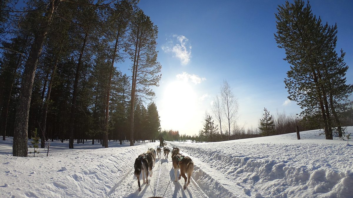 (Photo: Driver POV of sleigh ride in thick snow and bright sunshine in Rovaniemi. Credit: Lars Ley)