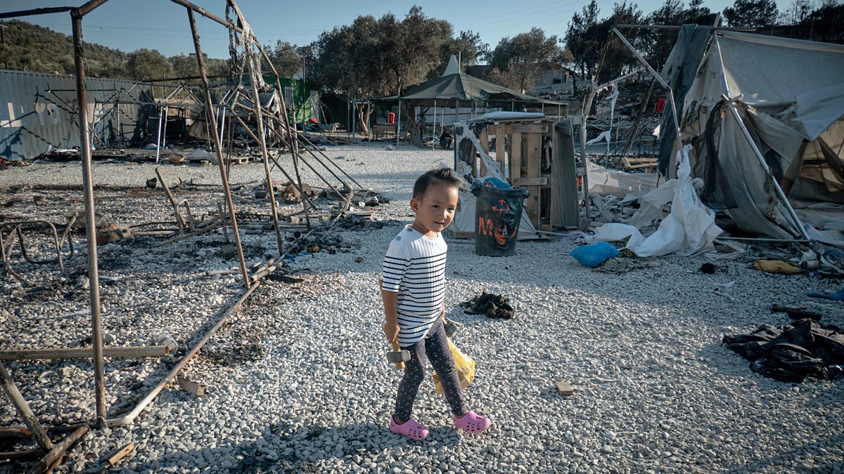 (Photo: Refugee girl playing in the ashes of the ruined Moria camp. Credit: Nicolas Economou/NurPhoto/Getty Images)
