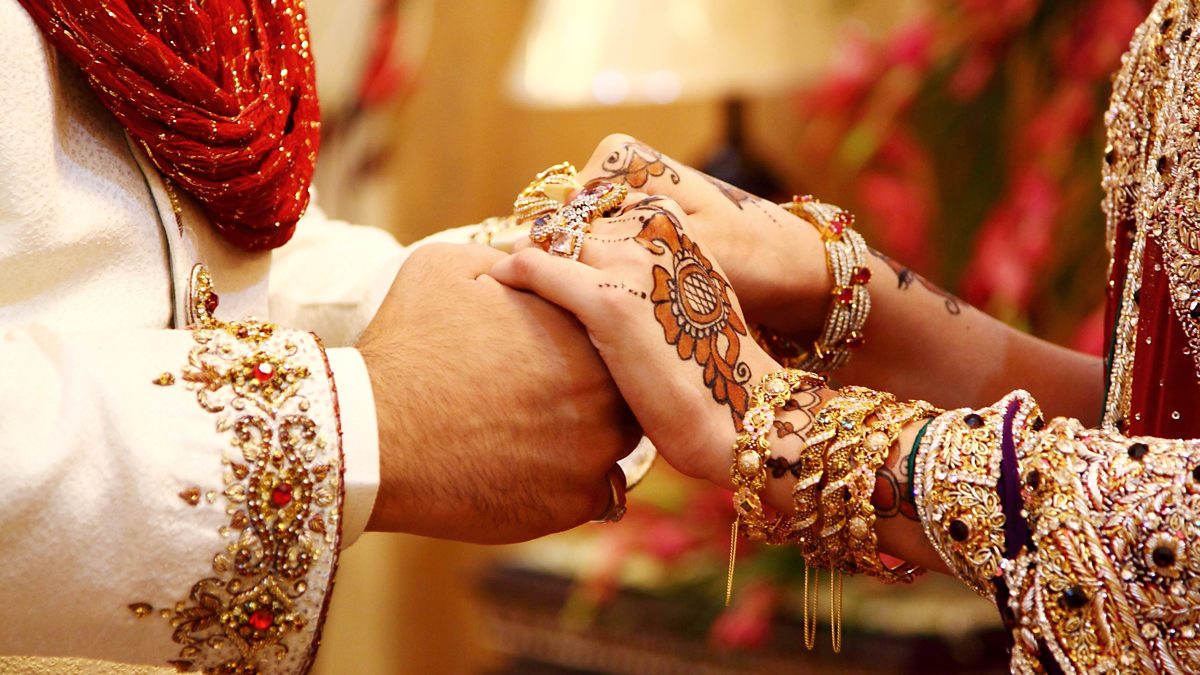 (Photo: Indian couple hold hands during a wedding ceremony. Credit: Amir Mukhtar/Getty Images)