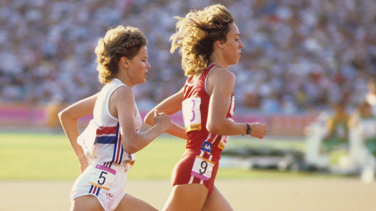PHOTO: Zola Budd, left, with Mary Decker in the 1984 Olympic final (Getty Images)