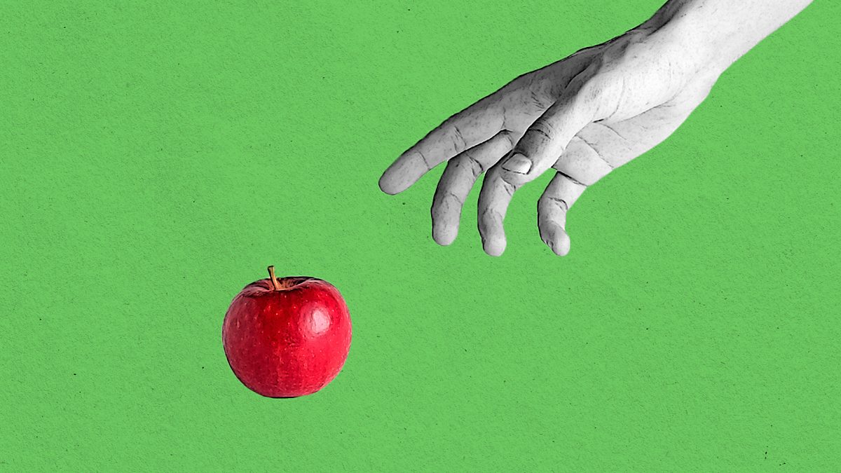 (Picture: Hand reaches for apple, Credit: Getty/BBC)