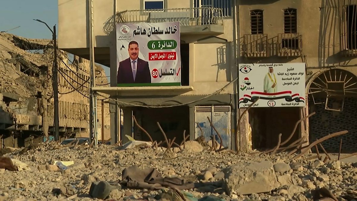 (Photo: Election banners in Mosul on sites destroyed in the liberation battle of 2017. Credit: BBC)