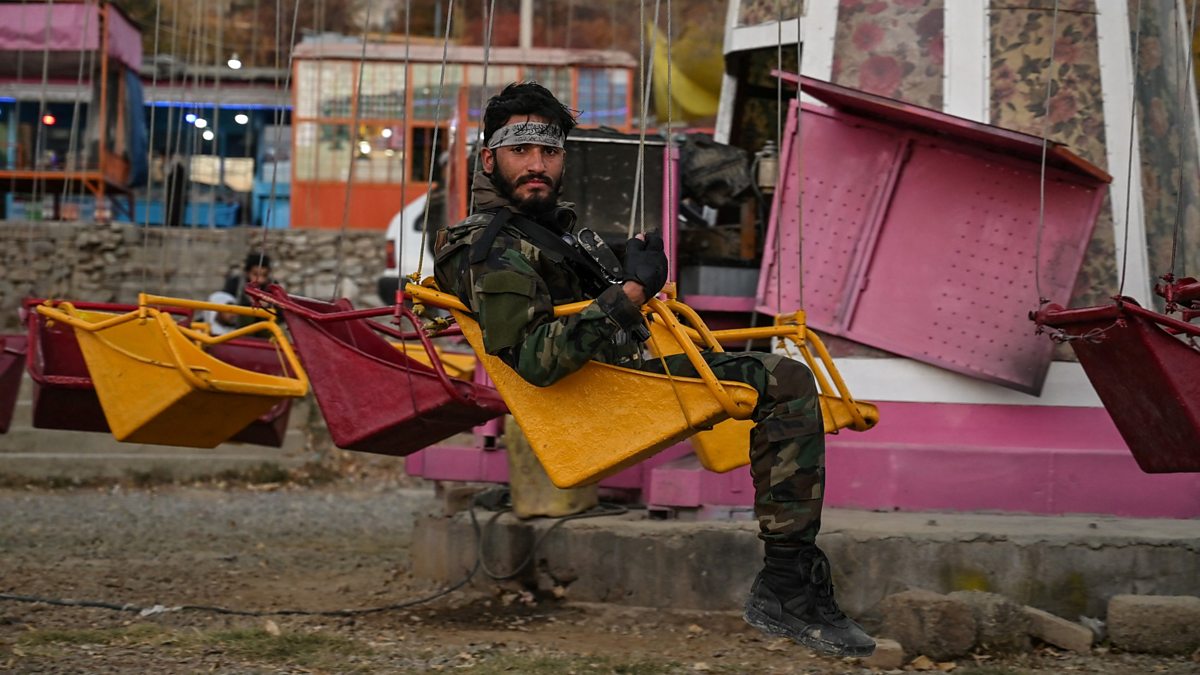 (Photo: Taliban fighter with gun sits on fun ride in Afghan amusement park, November 2021. Credit: Hector Retamal/AFP via Getty Images)