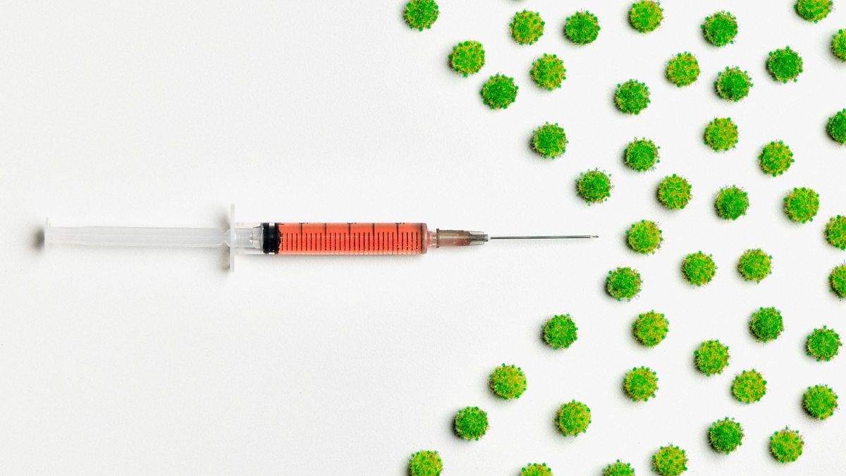 Picture: A medical syringe pointing towards a whole lot of green viruses, Credit: David Malan/Getty Images