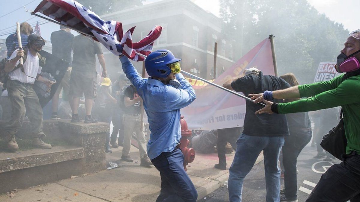 Rival protestors clash in Charlottesville, Virginia, in August 2017 – Credit: Getty Images