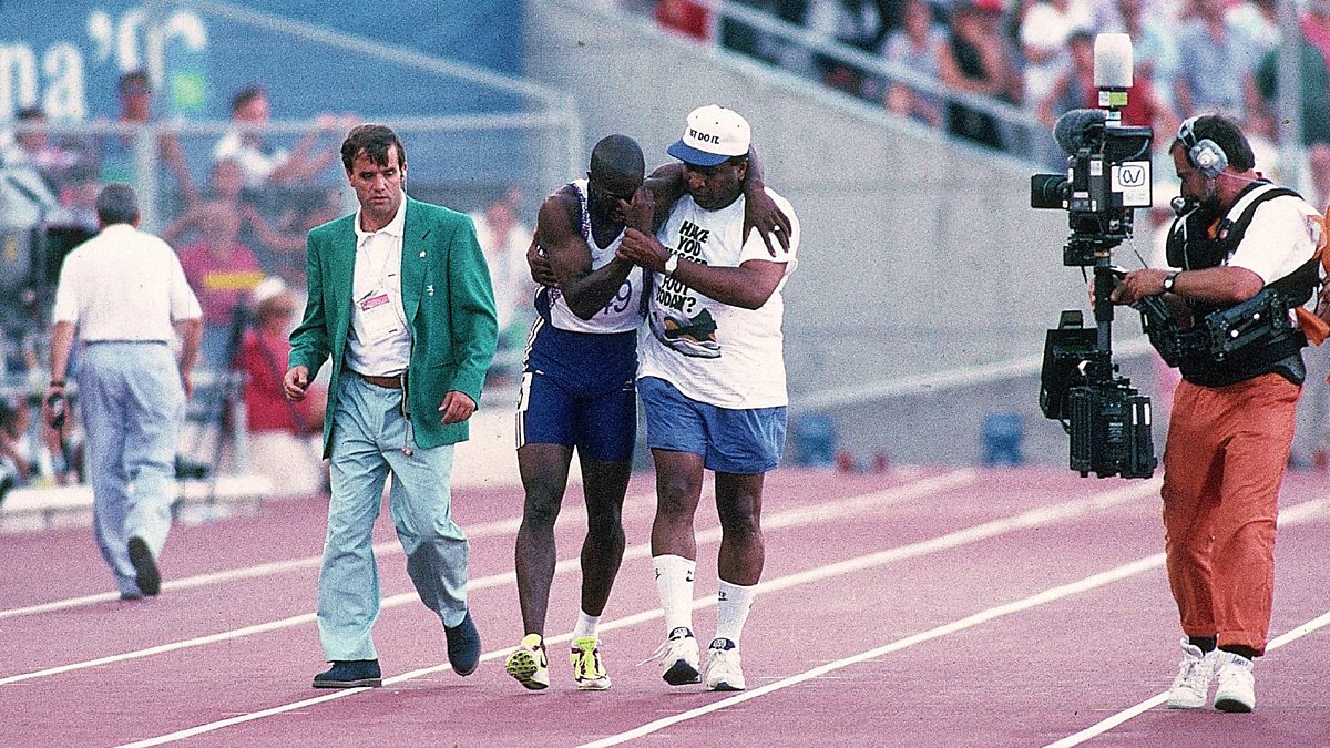 The image of Derek Redmond clutching his dad as he crossed the Olympic finish line in 1992 went down in history. He tore his hamstring but Derek was determined to finish the race.