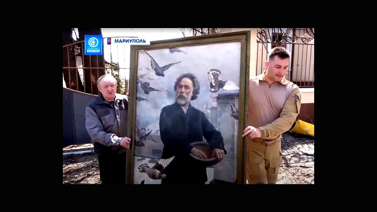(Photo: Russian journalists remove portrait of Arkhip Kuindzhi, painted by his pupil Grigory Kalmykov, from Mariupul Kuindzhi Art Museum basement. Credit: Screenshot from UNION TV Channel)