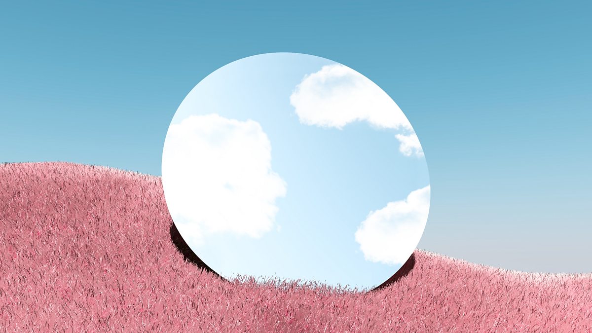 (Photo: Mirror reflecting blue sky in digital landscape. Credit: Artur Debat via Getty Images)