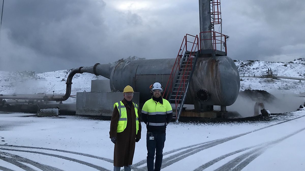 (Photo: Allan Little visits a deep drilling project in Iceland. Credit: Anna Horsbrugh-Porter)