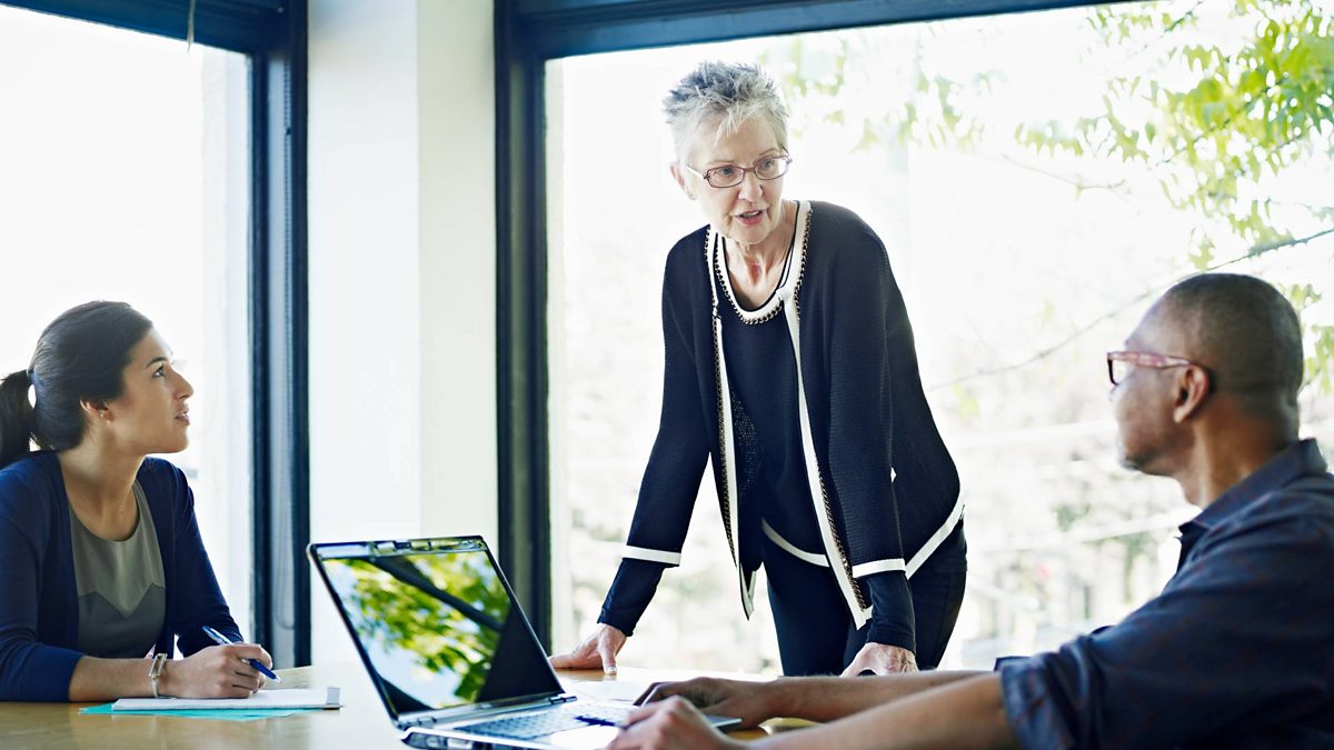 (Picture: A man and a woman sit at a table at work, with a woman standing up talking to them. Credit: Getty Images)