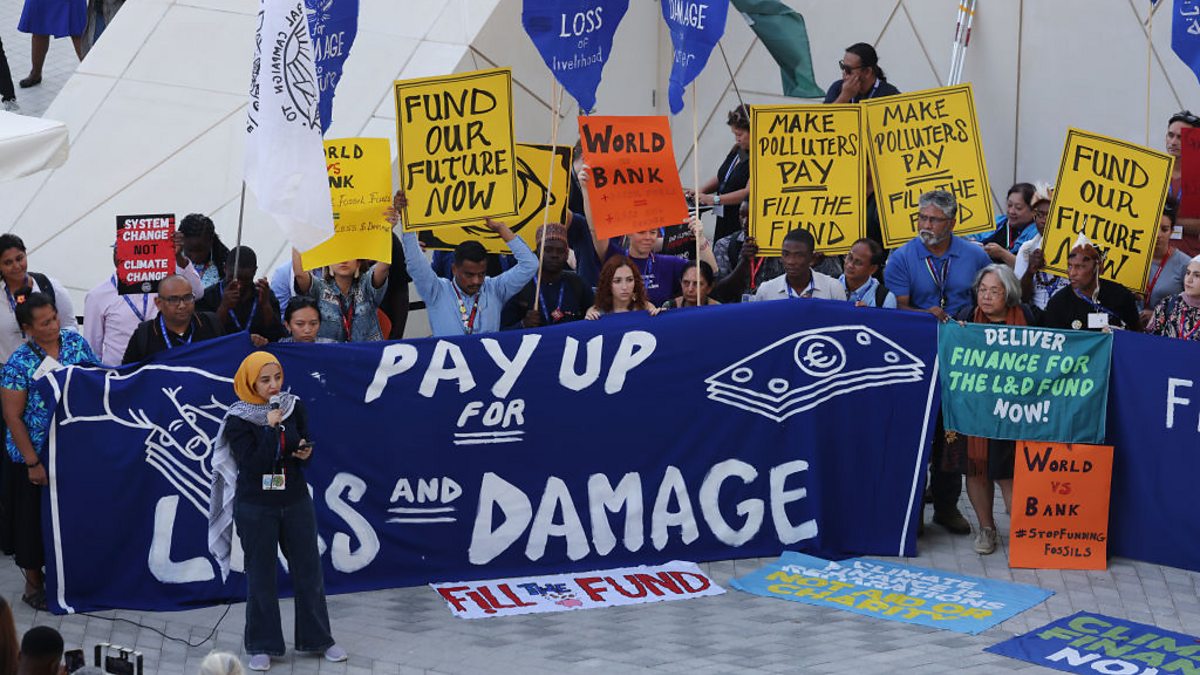 (Photo: Activists protest to demand loss and damage payments by rich countries to poor countries affected by climate change at COP28, Dubai. Credit: Sean Gallup/Getty Images)